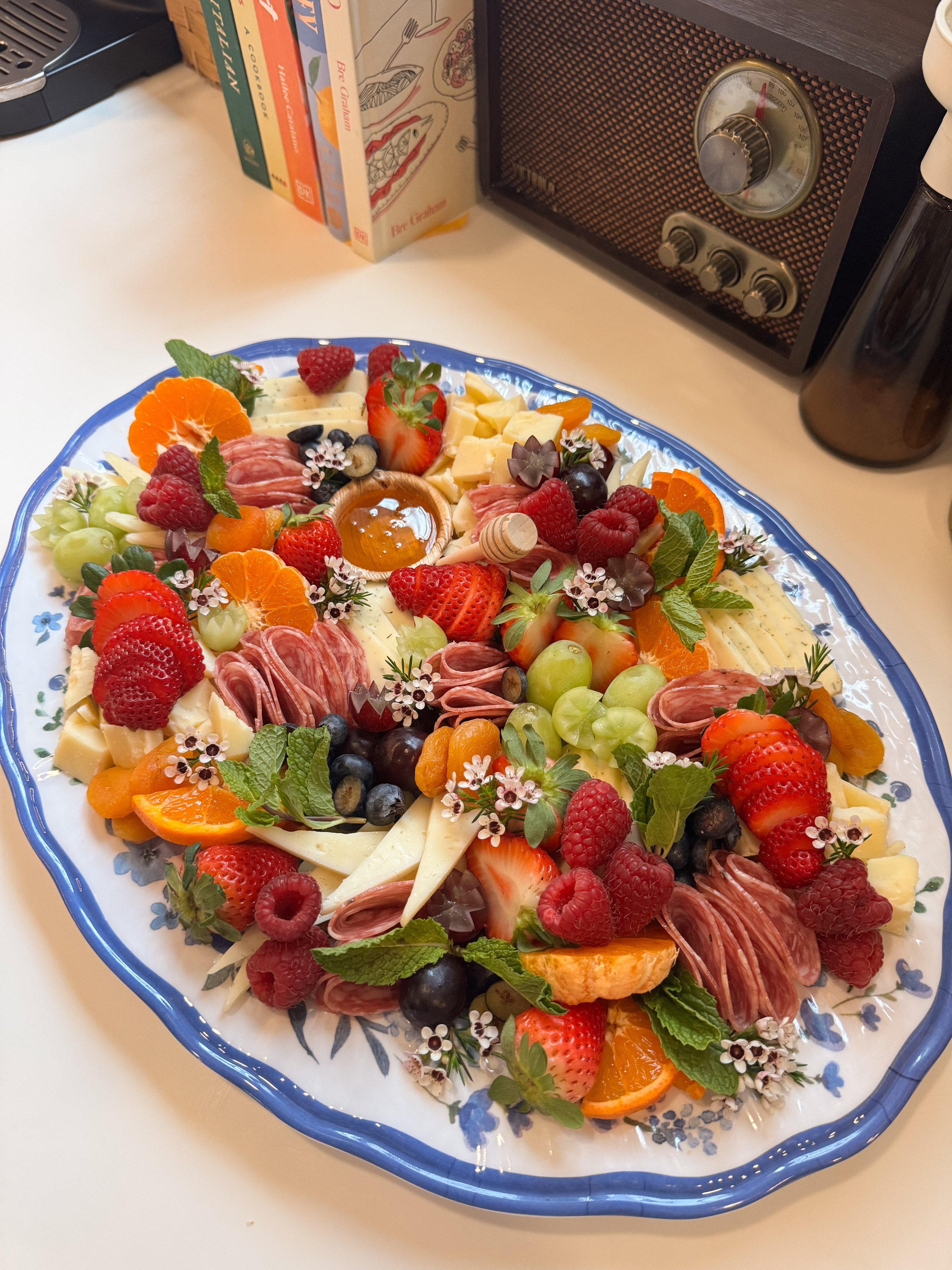 Select cheeses, cured meats, seasonal produce, nuts, local honey, seasonal accompaniments with crackers and sweet bites served on the side